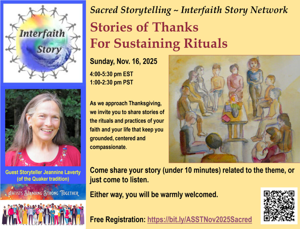 * Online Sacred Story Sunday Interfaith Story Circles (hosted by ASST.art ) on the third Sunday of every other month from 4-5:30 p.m. Eastern. Each circle has a theme, a guest storyteller and time for open story sharing by those who attend. Upcoming circles will be held on November 16th and January 18th.